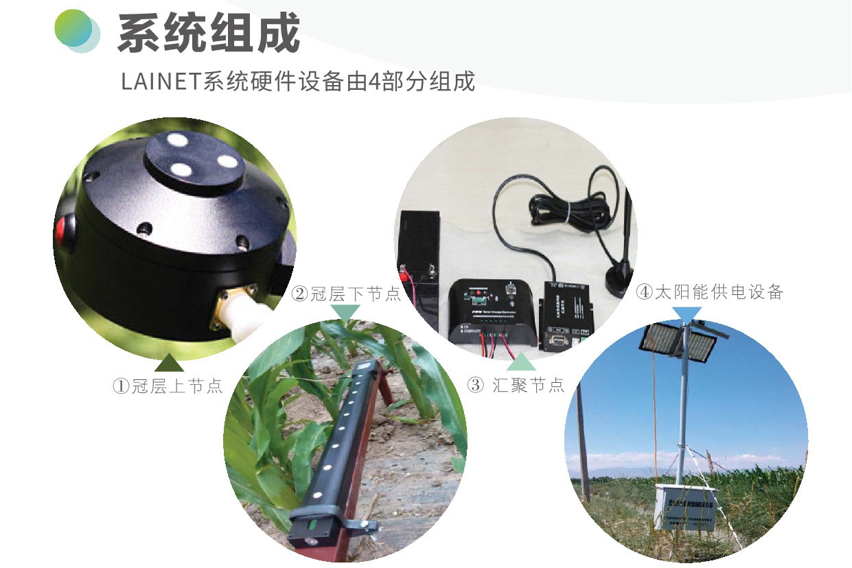 LAINET系统以具有无线数据收发功能的光量子传感器为基础,实现植被透射辐射的实时监测,并基于自主研发的高精度算法,计算得到植被冠层结构信息,如叶面积指数、平均叶倾角、聚集指数以及冠层覆盖度等。