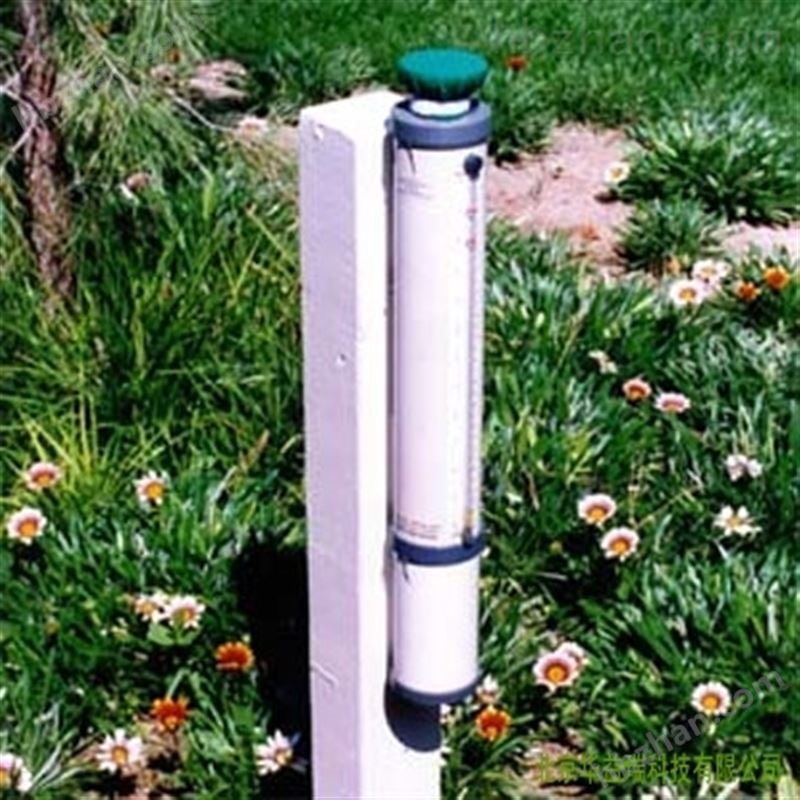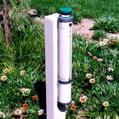 蒸发器中下的蓄水管中是蒸馏水,蒸发器使用相同的速率从蓄水管中汲取水分,通过土壤水分蒸发蒸腾损失总量,植物从土壤中取得水分。土壤水分蒸发蒸腾损失总量有1英寸,蓄水管中的水就下降1英寸。下降的水分首先必须要经过一个高精度的玻璃标定瓶,装满一个小瓶水就相当于有0.01英寸的土壤水分蒸发蒸腾损失总量。当小瓶出于空的状态时,电子感觉就可以探测到,并且立即通过一个三路螺纹真空管重新填满水。每填满一个0.01英寸水事件,在接线端子输出的信号就可以通过一个开关脉冲记录下来。